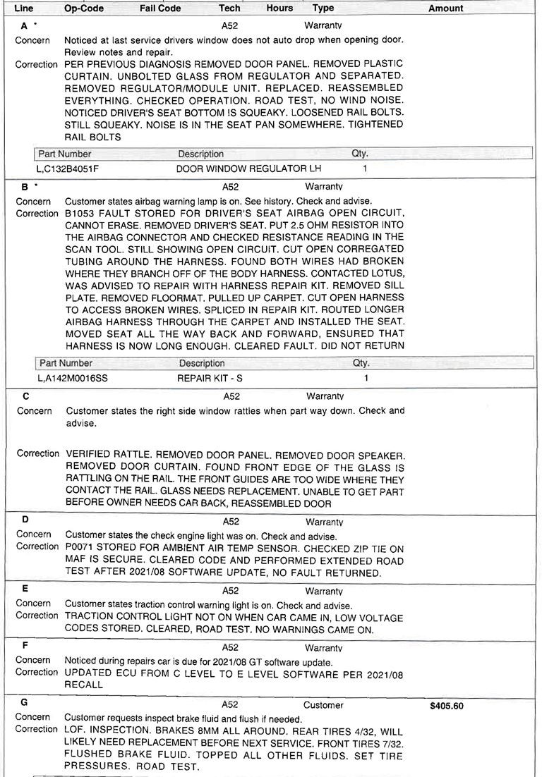 I promised to post the followup on this topic. I got the Evora GT back on Monday after the nearest (though not the selling) dealer handled warranty repairs on the airbag and the driver's window regulator. On the trip over I noticed that the passenger window rattled when partially down, and that is addressed in the shop notes too.
