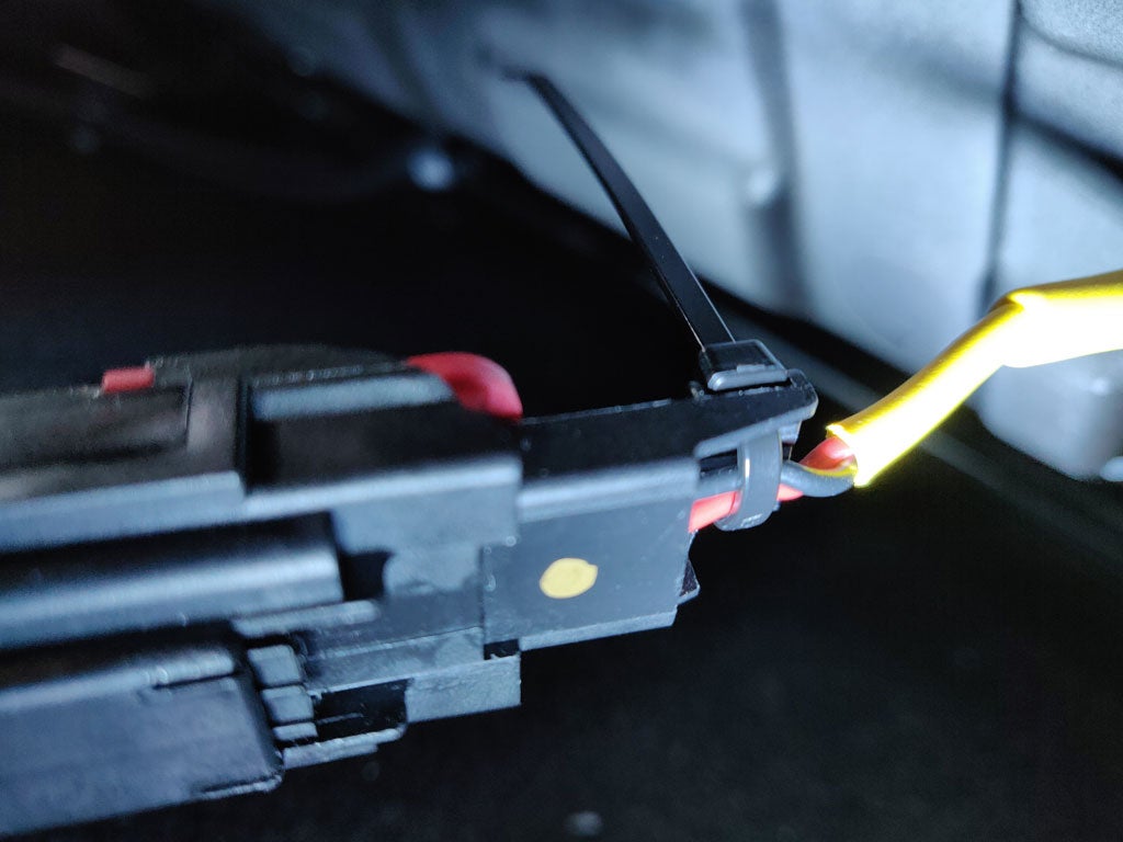 Look toward the bottom of the photo (which is the rear of the seat) and you can see another of those adhesive ziptie mounts, hanging in free space. Zero adhesion. However, the SRS harness and connector are held in place by three zipties which are themselves held to the seat by three of those push-in mounts like so many other automotive trim pieces use.